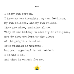 | #333 | "I am my own person. I have my own thoughts, my own feelings, my own beliefs, and my own values. They are mine, and mine alone. They do not belong to society or religion, nor do they conform to the views of the people around me. Your opinion is welcome, but your approval is not needed. I am who I am, and that is enough for me." —Inspiration to Overcome | You are who you are, and that is enough for you too. | ![]() | 2019/09/12 | #I2Oimage #I2Oquote |