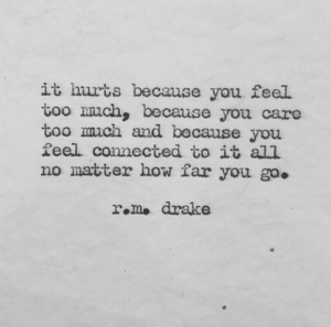 | #380 | "It hurts because you feel too much, because you care too much and because you feel connected to it all no matter how far you go." —R. M. Drake | Wherever I go, anxiety follows. Whatever I'm doing, OCD is there doing it with me. However far I travel, depression is not far behind. Mental illness knows no distance. The good news is that hope doesn't either. | ![]() | 2020/02/05 | #mentalhealthawareness |
